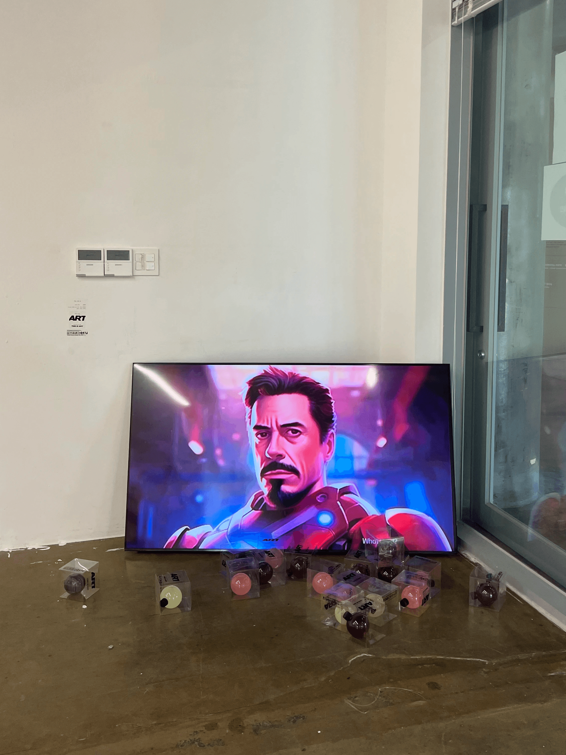 The installation consists of an AI-generated video and scattered, packaged drink objects. In the video, familiar figures from animation, cinema, and art history—characters and iconic artworks commonly associated with “art”—come into motion, each reciting one of the countless definitions of art. Gradually, these voices collapse into a repetitive chorus: “What is art? What is art?” On the floor, drink packages labeled “THIS IS ART” are dispersed throughout the space. The packaging states that the contents are art, are consumable, and that the creator takes no responsibility for anything that may happen after consumption—inviting viewers to freely enjoy, ingest, or ignore them. This ironic gesture confronts authorship, responsibility, and value, while questioning whether declaration alone is enough to make something art. And the project was installed amid an exhibition of purely traditional paintings, heightening its tension and significance.